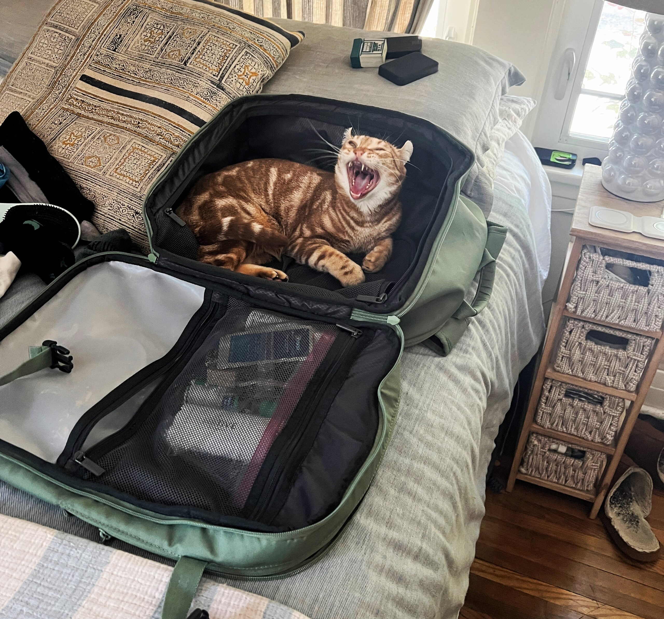 With a sharp hiss and a demonstrative display of fangs, this recalcitrant quadruped defends her intrusion into what she presumes to be an extended journey of cooperation. Felis Stowawayis, known to natives as the North American Travel Cat, parasitically embeds herself in the external habiliment pouch of one Humanus Worktripus, an exhausted and dispirited biped who does not share his furry freeloader’s enthusiasm for a joint sojourn.